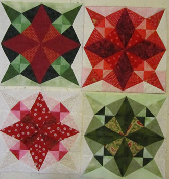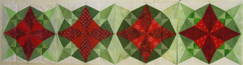 I’ve been playing with the colours and layout for a Christmas runner- see my earlier post with my initial test blocks, made with templates from Marti Michell.