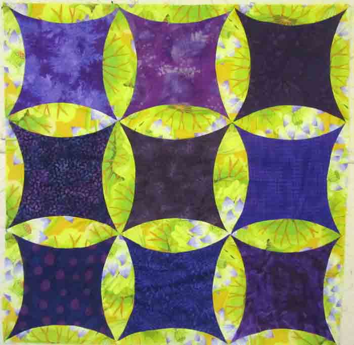 Next up: another quilt that uses a Fassett fabric, this one is just a baby-size quilt. I made the blocks with my favourite tool, Marti Michell templates ( this was the double wedding ring set). It sat unfinished for quite a while when I realized I had used the same purple batik in two of the blocks- bummer. I finally got the seam ripper out and replaced it. The points on this aren’t perfect, but that is never my most important criteria for a quilt, and I do love these colours together.