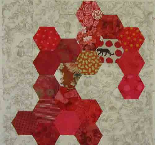 I have made a few of hexagon quilts, and love the look. But because I sew these on the machine, rather than by hand, it can be a bit tedious. Below are two sets of hexagon “scraps” that I have put together from some asian-inspired fabrics.. the red one will probably become part of a pillow cover one day. The other I envisage as a large panel down the centre of a bed quilt on a ground of a solid or fairly subdued patterned fabric.