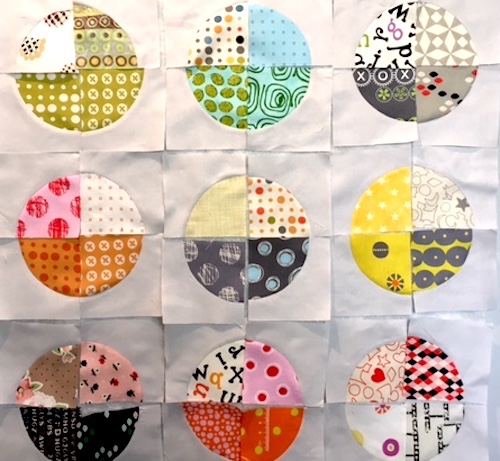 I enjoyed making these blocks so much that I selected more charm square blocks, and combined them with Kona Silver. I am only using one of the two blocks this pattern makes here (love circles right now!), so I will have lots of leftovers for another project, another day. So far I have only made 70 of these. Right now I am thinking of using them to make placemats and a table runner… we’ll see.
