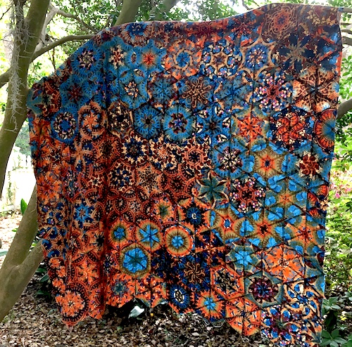Before I left for Georgia, I spent a wonderful day with Shirley and Jane preparing fabric to make a one block wonder quilt. Can’t wait to see what their quilts turn out like! I love making this quilt as I don’t have to think about the fabric at all after I have made my initial selection, and I have made a number of these quilts already. After carefully setting up your fabric, just cut and sew, and watch with wonder how the blocks turn out. I found enough fabric in my stash to make 6 more of these quilts.. sigh! I pieced this while away, and photographed it hanging from a branch of a magnolia tree in our side yard.. lots of Spanish moss in the garden!