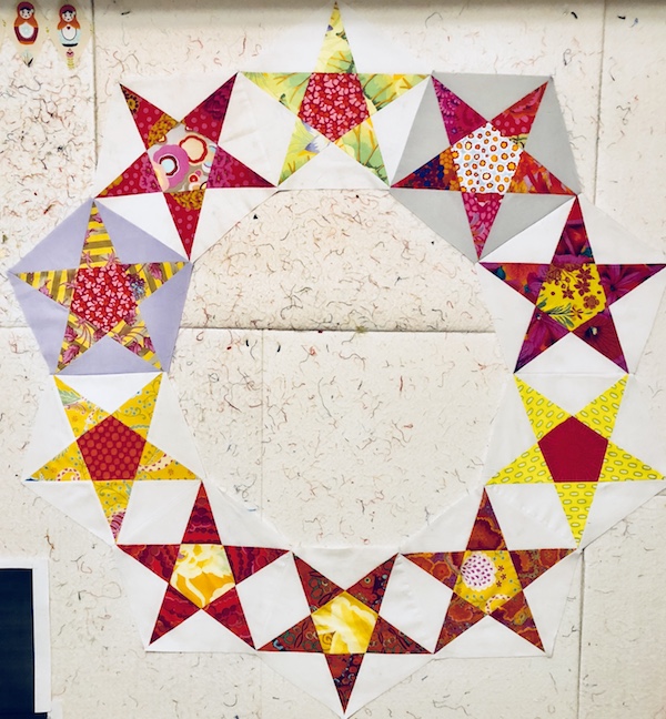 These star blocks were made with templates I had purchased from Baycreek Quilting Templates. Because the blocks did not finish square, I was kind of stumped in how to use them. Today I sewed them together, and they form a very nice circle.. I think I will applique them onto a background fabric… to be determined!