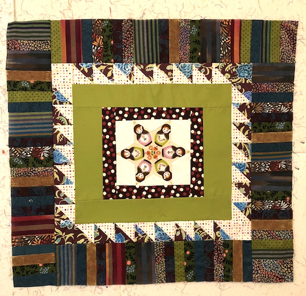 Next up was the centre block, with the fussy cut matryoshka dolls. I got busy and added several rounds to make it larger, but I think I will put it aside and think about what the next round in this medallion quilt should be.