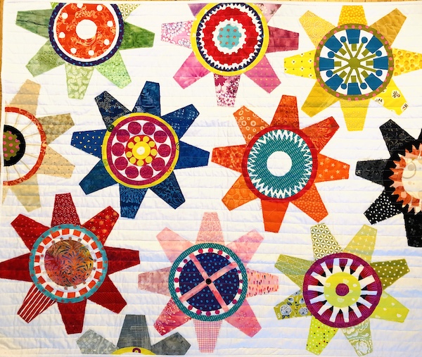 I have been playing with tumbler blocks a lot recently, and this is the other piece I finished a few weeks ago. This is such a bright and happy piece, it really makes me smile. I especially enjoyed filling the centre of each “cog” with a different design. Most of the design elements were fused to the background, and only needs a hanging sleeve to finish it up- I have hestitated because I am not sure what orientation I want it to hang. Size : 89 x 107 cm (35 x 42″).