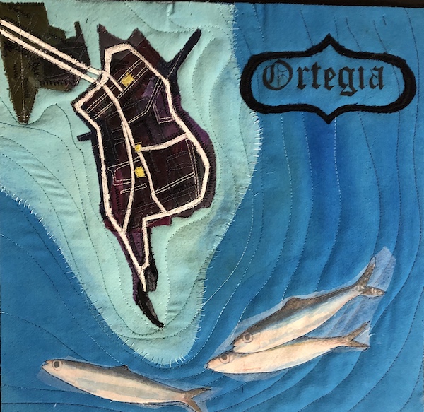 I realize that I never posted the completed quilt of Ortegia, Valerie Goodwin-style, so here it is. It is hard to see the details on the island itself because of the black background, but I am pretty happy with the final result, except for the white roads. I tried various paints for this feature, but never got a completely solid line. Next time I would reverse the colours of the island and the roads, so black roads, white island. This is a small piece, about 28 cm (11 inches) square.