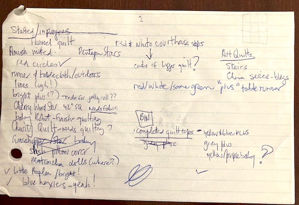 So I started going through all the places I store fabric and projects — past present and future. I found so many wonderful fabrics that I started to add them as “unfinished” projects. These were so tempting I wanted to jump right in- I had to stop myself! Meanwhile I had found 20 UFOs so far, with no end in sight. This was taking way too long- I could have finished a project with the time I had spent here! Looking back at this book I had created, done in 2016, I see I have finished seven of these projects. One I packed up and donated to Value Village in frustration (paper-pieced, with too many intersections with too much paper). Hopefully some quilter stumbled on it and thought she had died and gone to heaven.
