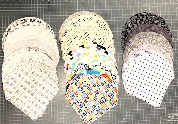 Yes, I recently posted all some of the unfinished projects I SHOULD be working on.. but for some reason I felt I “needed” to make a clamshell quilt. I have lots of white and black fabric from previous quilts I have made, photos below, so no need to shop for fabric. [I have decided not to buy any more fabric online, in person only, and in fact I do not need more fabric! Maybe for the backing though?? ] The one problem I can see with this quilt getting finished is that I will need to hand sew the blocks down. Anyway, blocks are cut! Off to the design wall.
