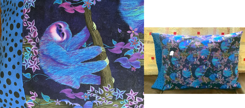 One of my granddaughters loves animals- everything from spiders to snakes and more. Right now her favourites are red pandas (and a baby panda has just been born at the Toronto Zoo!), and sloths. She reads voraciously and retains everything she reads, so I now know a LOT about these animals. I was at a local fabric shop yesterday looking for some backing fabric, and could not resist this sloth fabric. I turned it into a pillowcase for her.. hope she likes it!
