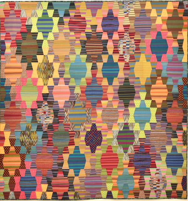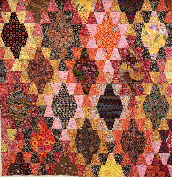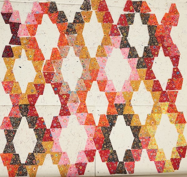 And here is the final layout. This is the second tumbler quilt I have made using mostly Kaffe fabrics. I quilted this one with curved ribbons, a la Jacquie Gering. Just need to add the binding!
