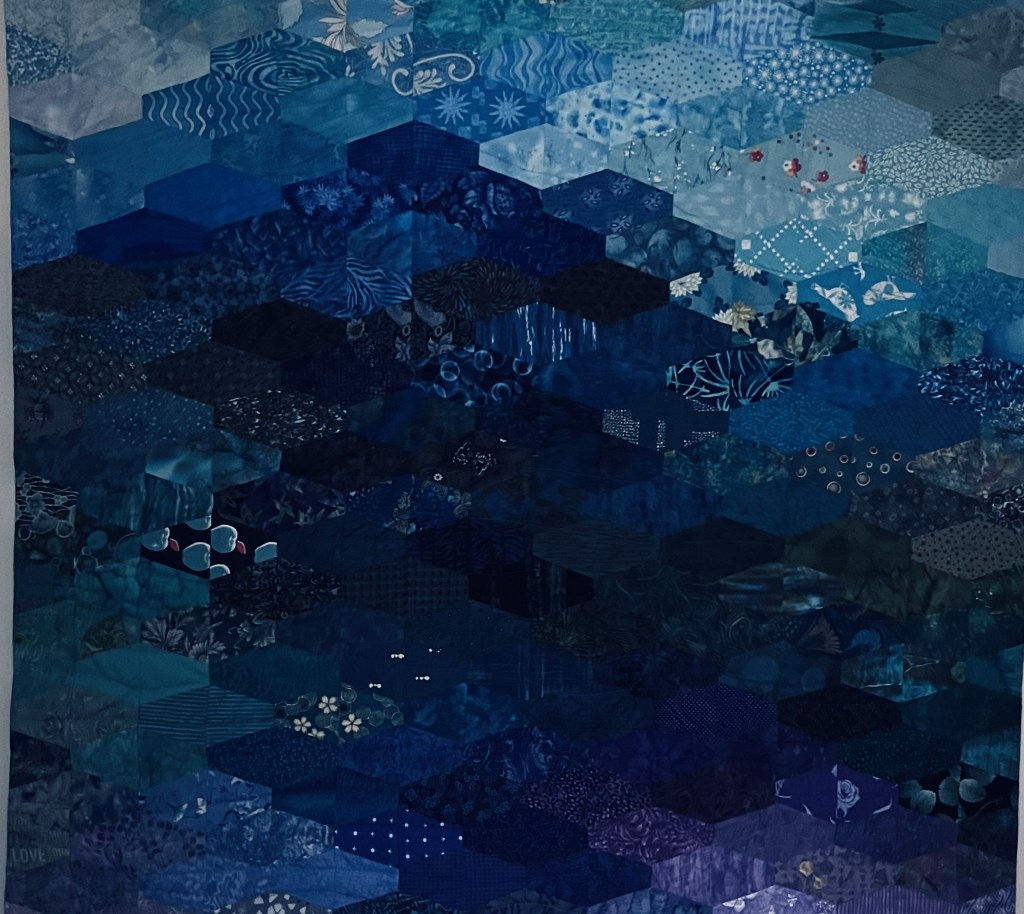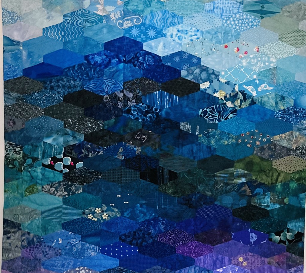 This was not quite what Imagined…. but the other night, sitting in a darkened room, I looked at the quilt, hanging on wall 20 feet away. The low light captured the quilt I was trying to make… more subtle and mysterious. Can you see the difference? I am so happy now!