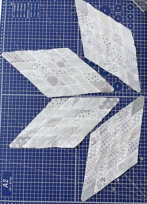 Even though I am mostly known for using lots of patterned fabrics and bright colours, I seem to have become obsessed with making diamonds of whitish fabrics, part of my exploration of lone star quilt design possibilities. Here are 4 blocks I have just completed. Love, love, love!