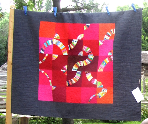 It was made for a challenge I set at Quilts at the Creek. We supplied some fat quarters to those interested in participating, and the quilt had to incorporate those fabrics in the completed quilt. The fabrics are the ones in the centre of my quilt, and I struggled to find something to make it stand out. I had it quilted (thanks again, Sandy!), and stared at it long and hard. Finally I came up with the idea of making bias binding and attaching it to the quilt. I loved the final look of the quilt, and was so happy with the bias binding idea I had “created”. One day I googled it, and found other quilts made using this technique. My favourite is Joe Cunningham, see his quilts below. Stunning!