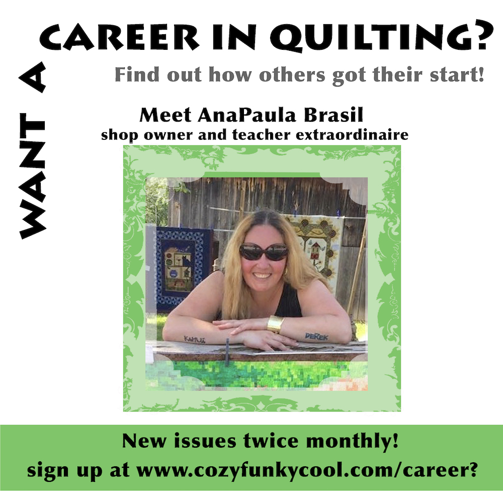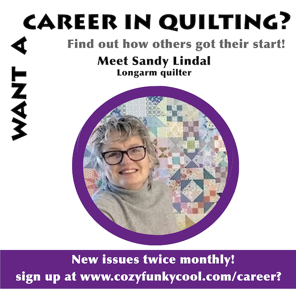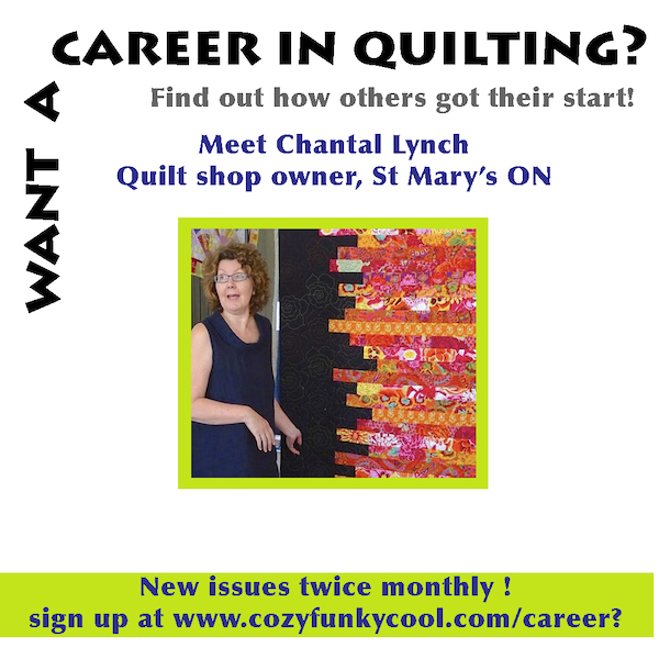 I live in Toronto and have been a quilter for almost 15 years. At various times I have belonged to 3 separate quilt guilds in the city as well as SAQA. These are all great places to meet interesting people who love quilting, and over the years I have seen some of them really grow passionate about one particular aspect of quilting, and turn it into a career. This might be part-time, full time or an occasional business, but they have followed their passion. I thought I would capture their stories and share them with you.
